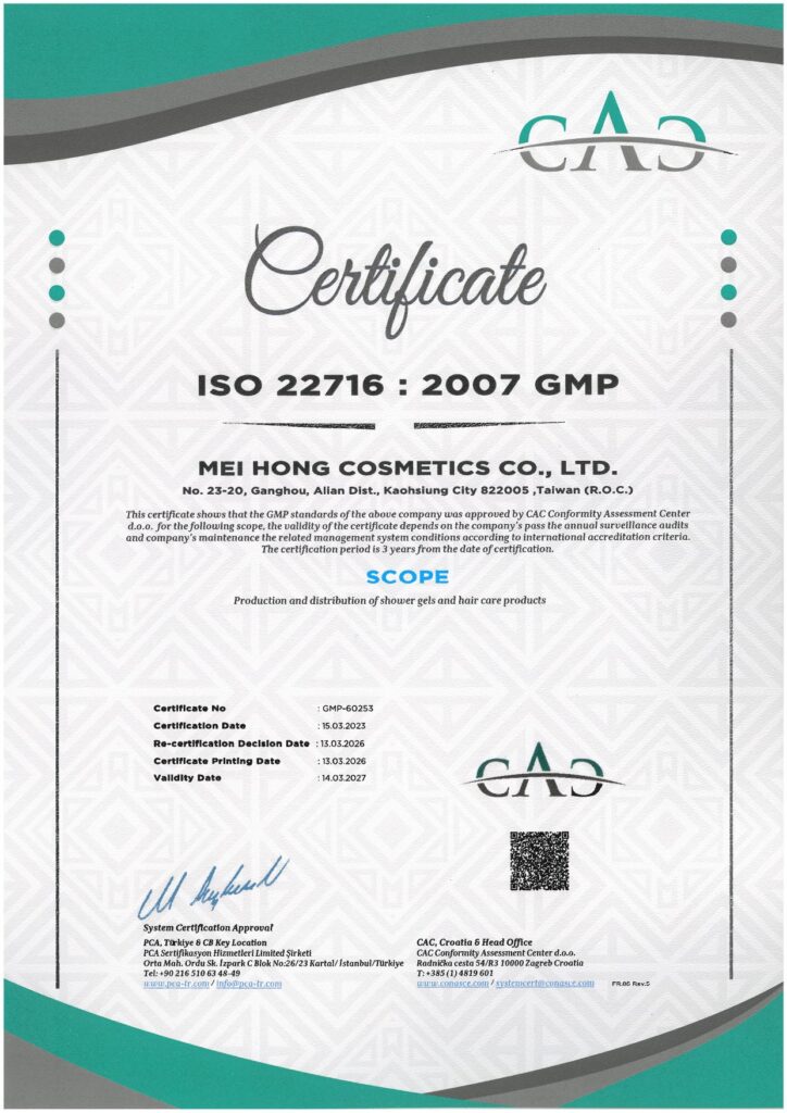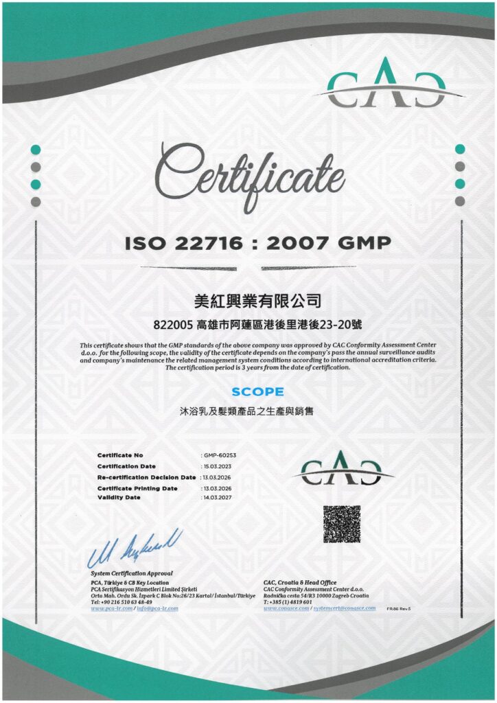 美紅興業有限公司專注於美髮產品製造,今年順利通過 ISO 22716(化妝品GMP)年度稽核,